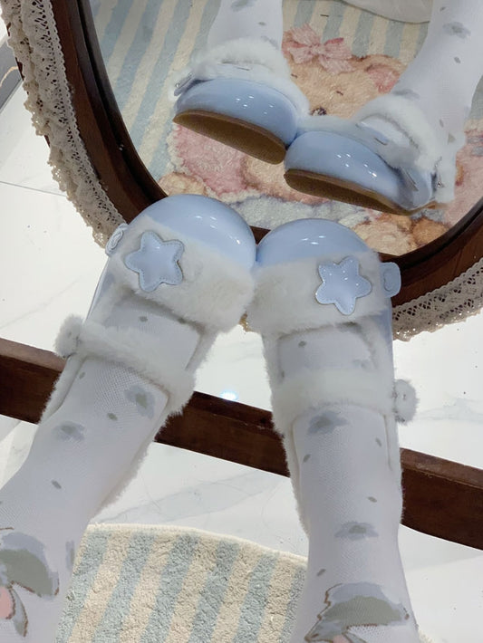 Accent Flats Button Star Baby Plush Lolita Sweet Detail - Cozy for Snap Blue Strap Winter
