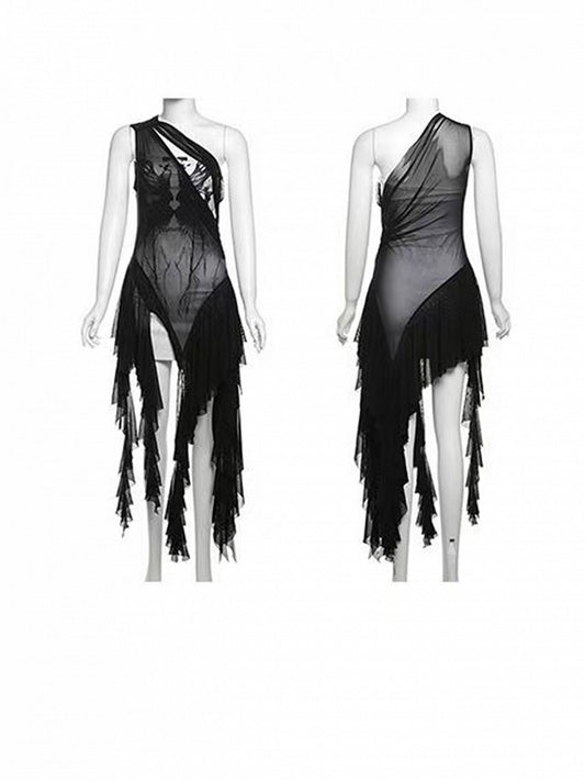 A-Line Mini Dress with Bell Sleeves Black Punk Semi-sheer Lace