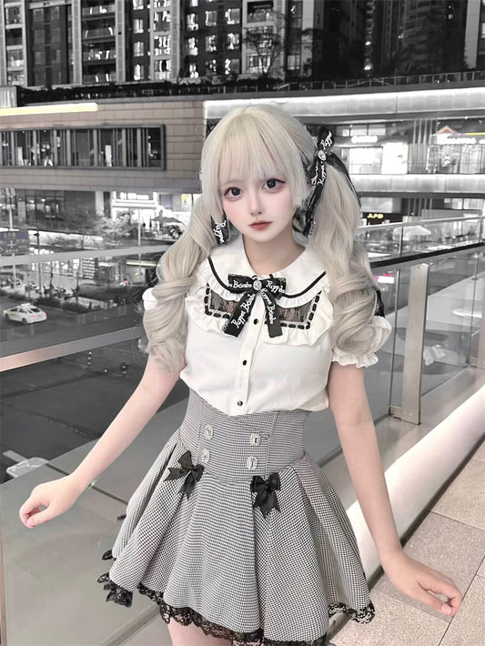 Accents Jirai Kei Gray Houndstooth Bowknot Lace Trim Rhinestones Embellished Skort