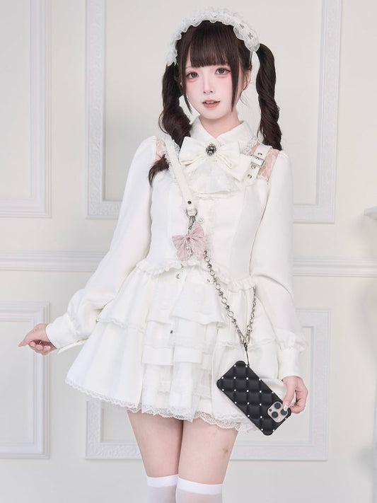 Aesthetic Jirai Waist for White Shoulder - Smocked a Dress Clean Kei Cutout Ruffles Tiered