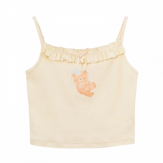Adorable Bear Print Cami Top Neckline Light Yellow Ruffle