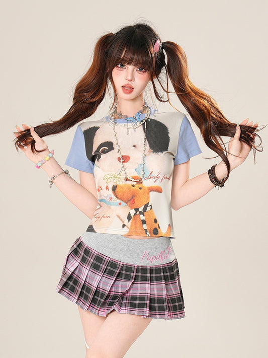 Adorable Colorblock Design Puppy Print Blue/Pink T-Shirt