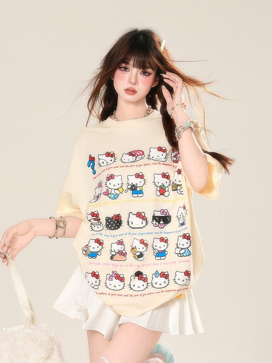 Adorable Kitty Print Apricot Loose T-Shirt