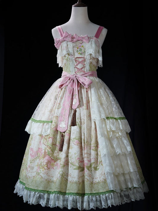 and Ruffles Pink Lace Jumper with Princess Layered Floral-Print Trimmings Lolita Skirt