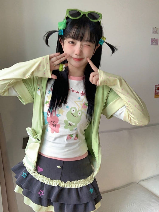 Animals White Yellow Sleeves Print Stars Cute Top