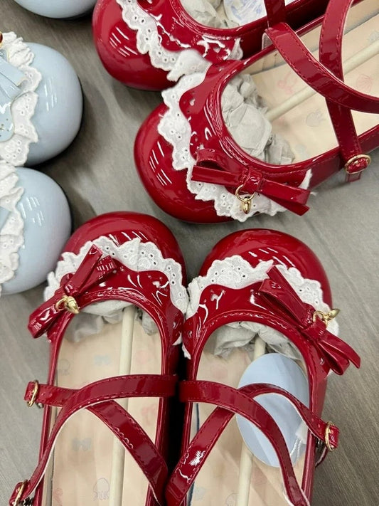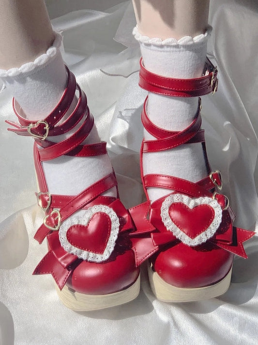 - Heart Bow Lace Janes on Red Details Heeled Lolita Mary Charm 5cm Sweet