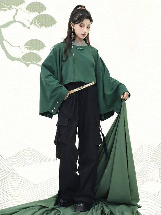 - Buttons Unisex Han Two-Piece Long Green Banded with Frog Lolita Sleeve Top Decorative Collar