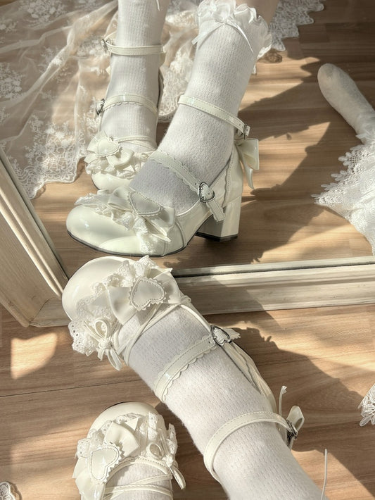 - with Heart Straps Mid Elegant Heels Cutout White PU Lolita Buckle Triple Heel Leather