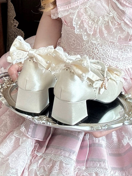 Beads Bow Creamy Princess Accents White Neckline Ribbon Dress Lolita