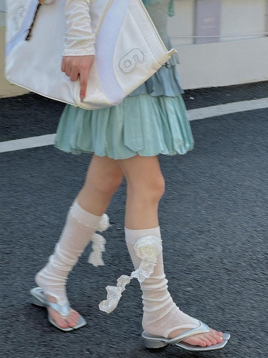 Stockings Creamy White Garter Set + Bow Leg Over Ruffled Knee