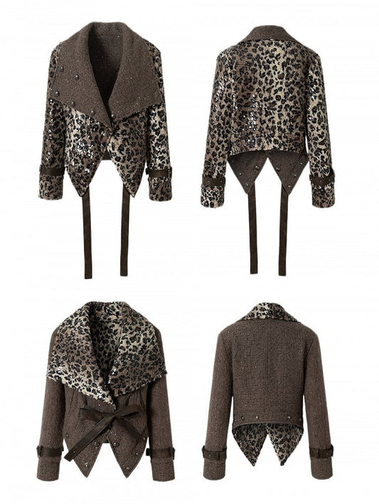 Straps Wool Coat with Tie Vintage Fabric Punk Leopard/Brown PU Reversible