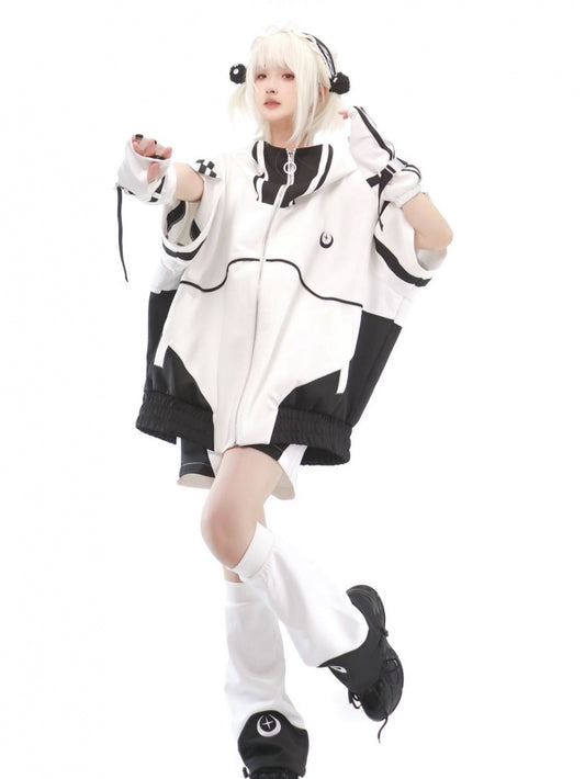 Black and White Jirai Kei Techwear Straps Design Hooded Windbreaker Jacket