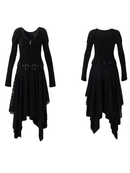 Black Dress Sleeve Knit with Waist Punk Hem Tiered Handkerchief Juliette Studded