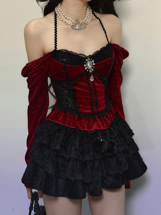 Red Roses Neckline Lolita Goth Boning Dress Sequins Tiered Ruffle Dress