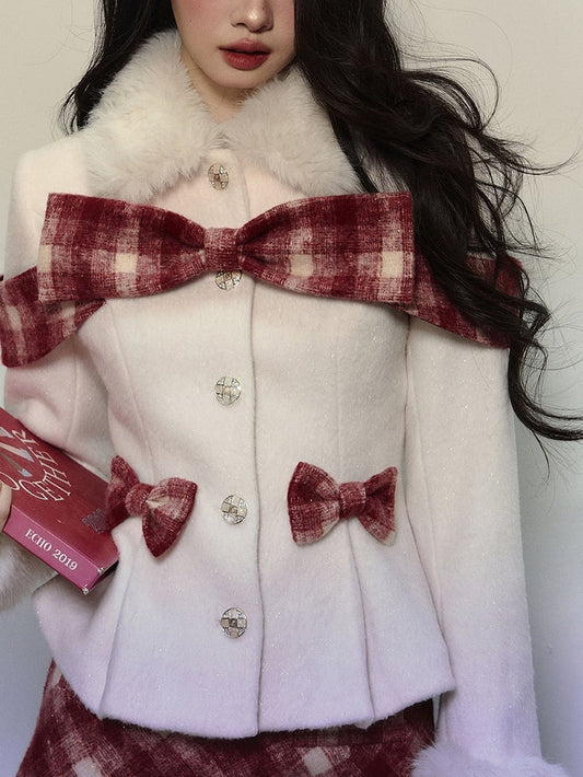 Apricot Plaid Bow Accents Woolen Jacket