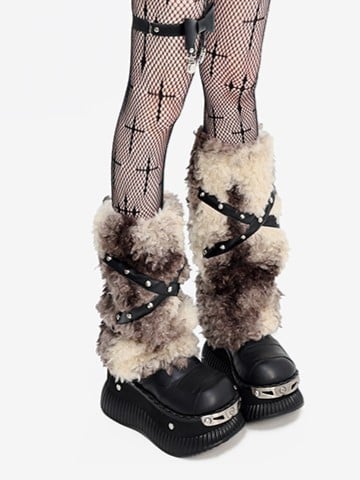 Strap Design Faux Fur Leg Warmers with Crossed Khaki Beige/Black Beige