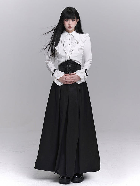 with Waist Accents Metal Ankle-Length Buckle Corset Black Embroidered Skirt Gothic