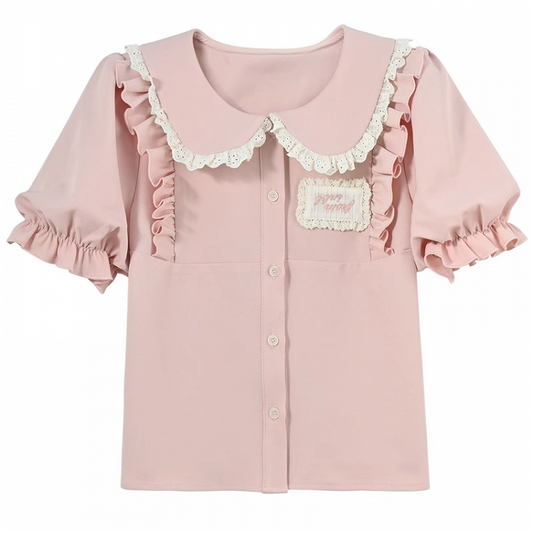 Pink Ruffled Peter Pan Collar Puff Sleeves Applique Embroidered Blouse