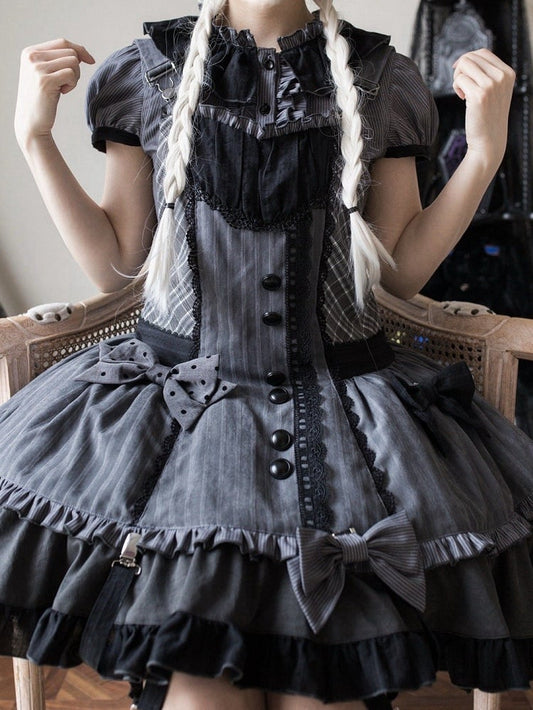 Detachable Bodice Gray Dark Overall Hood Plaid Lolita Ears Bunny Dress with Pattern