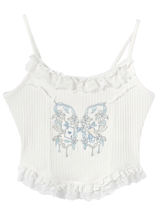 White Butterfly Embroidery Ruffled Lace Hem Holiday Cami Top