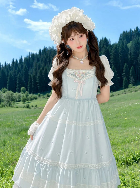 Country Neckline Cottagecore Square Kei Dress Elegant Blue Floral Lolita Mori Embroidery