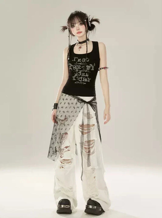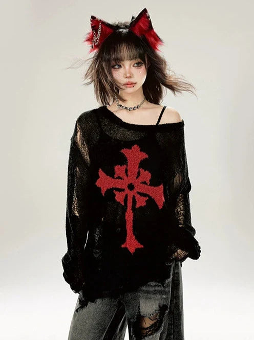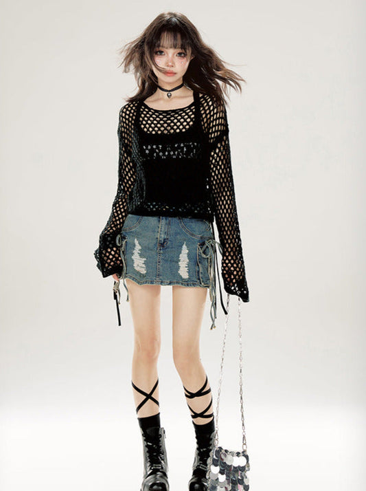 Cutout Ripped Loose Summer Knit Dark Print Black
