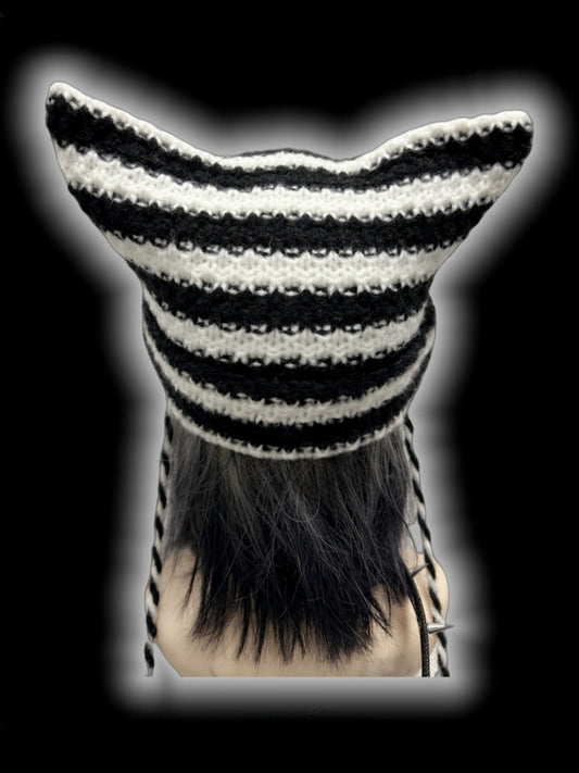 Black and White Cross Appliques Cat Ears Striped Beanie