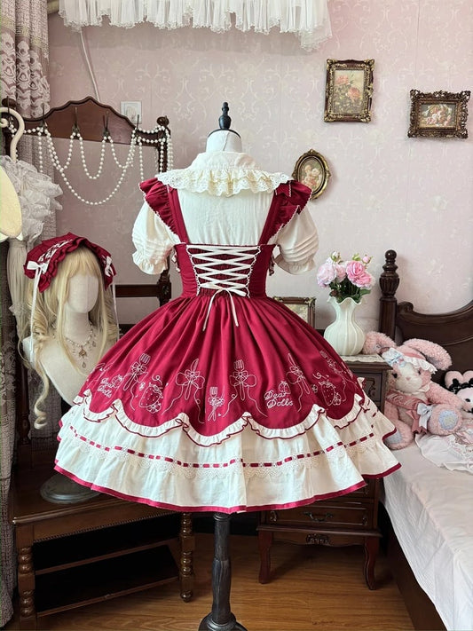 Red Flutter Sleeves Strawberry Embroidery Cottagecore Wine