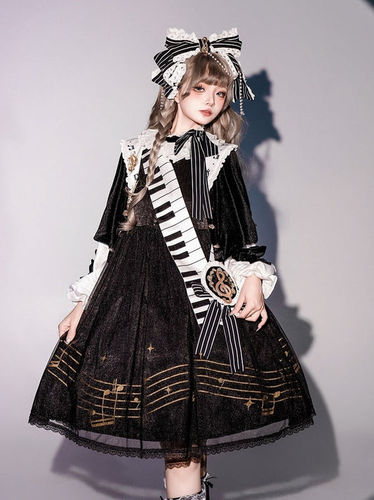 Black and White Ouji Lolita Full Set - White Shirt + Black Shorts + Musical Note Print Black Robe