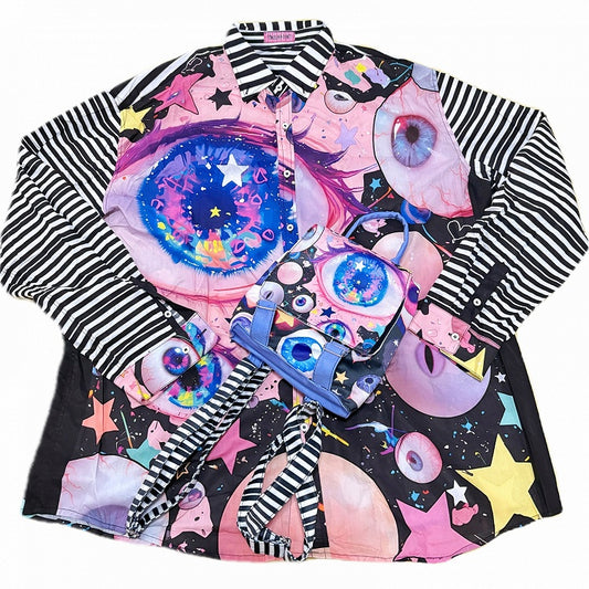 Shirt Kawaii Black Print Guro Striped Eyes Sleeves Oversized