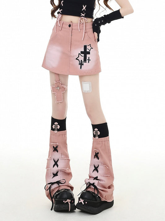 Lace-up Garter Leg and Warmers with Black/Pink All-in-one Cross Applique Skort