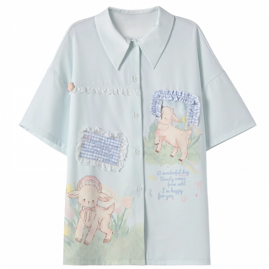 Plaid Applique Lamb Print Light Green Chiffon Lace Trim Shirt