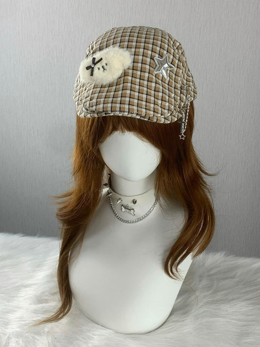 Black/Brown Plaid Beret with Puppy Plushie