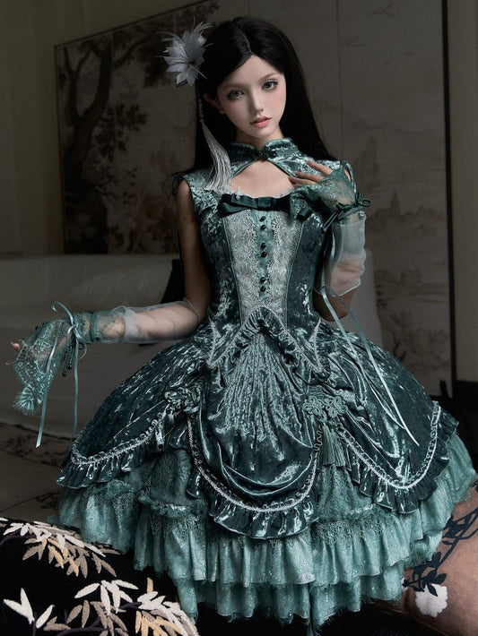 Green Gothic Lolita Velvet Tassel Knot Button Drawstring Skirt