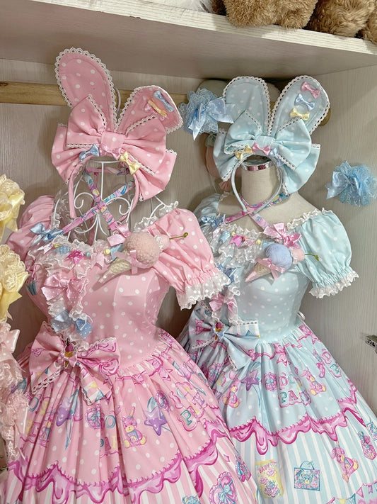 Lolita Bunny Sweet Short Print Puff Sleeves Teddy Pink and Doll