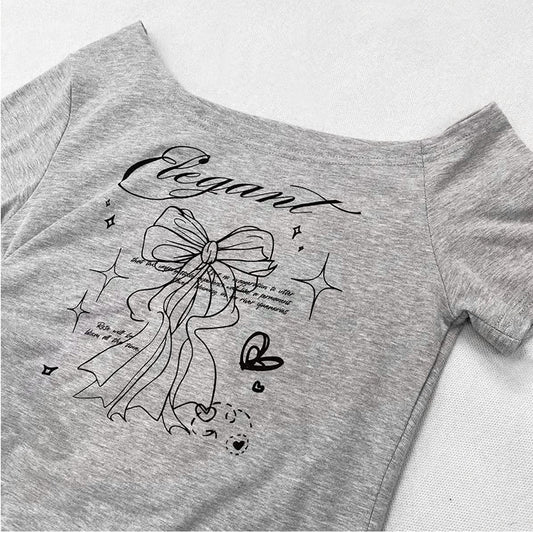 Lace Print Glamorous Letter Neckline Bow Asymmetrical And Gray