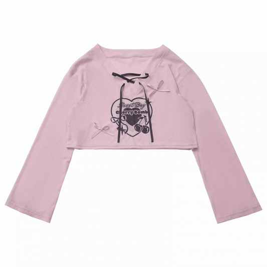 Pink V-Neck Cherry Print Lace-up Neckline Cropped Coverup