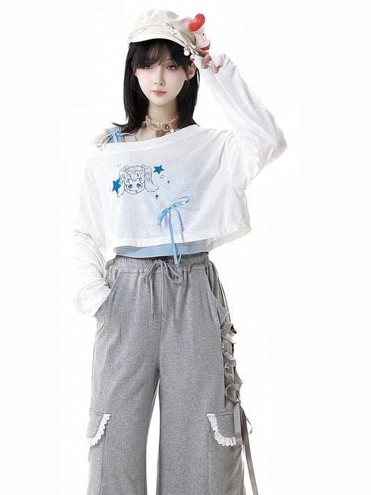 Two-pieces Halter Neck White/Black Faux Kawaii Daily T-shirt