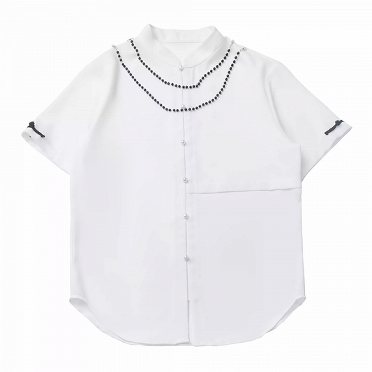 White Banded Collar Cheongsam Style Shirt with Detachable Beaded Chains