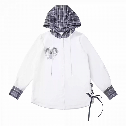 Kitty Ears Hood Design Plaid Side Lace-up Chiffon Shirt White