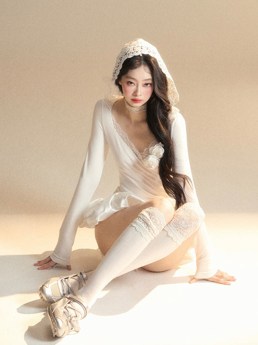 Floral Accents Lace Skirt Mini Bubble Trim White V-Neck Dress Hooded Glamorous