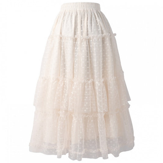 Apricot Elastic Waist Heart Pattern Mesh Tiered Skirt