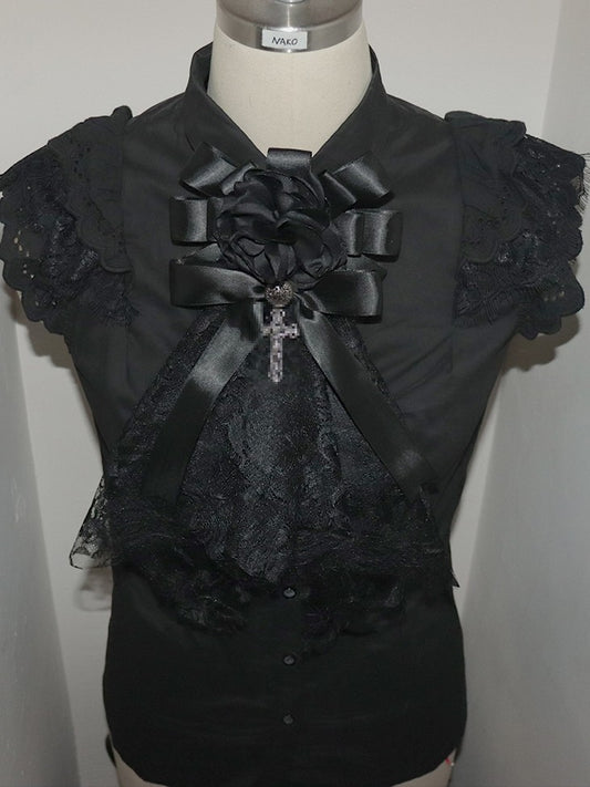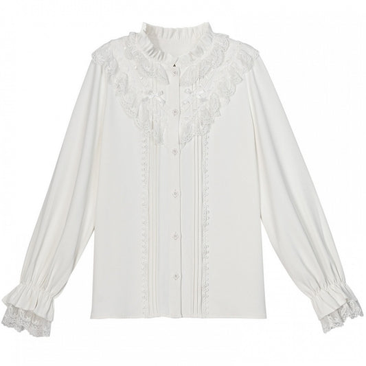 Details Blouse White Chiffon Lace Trim Bowknot Ruffled