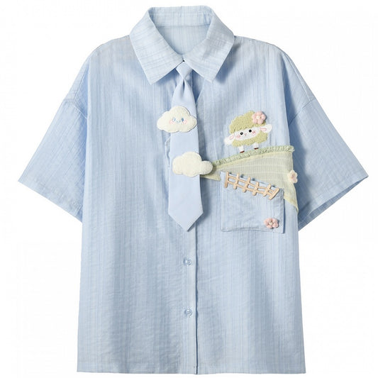Embellished with Lamb Light Blue Shirt Tie Yume Embroidery Kawaii Cloudes