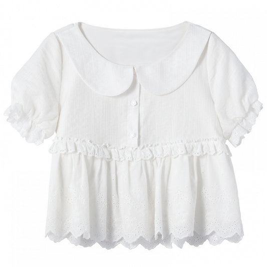 Lace Trim Blouse White Peter Pan Collar Puff Sleeves