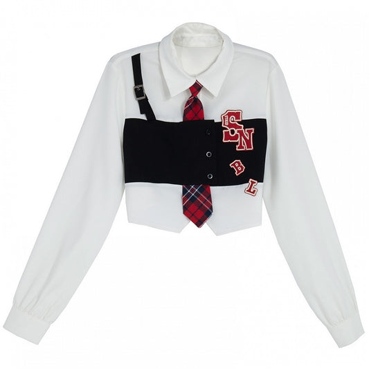 Plaid White Black Style Buckle Preppy Letter Applique Strap Tie Shirt with