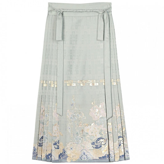 Cheongsam Jacquard Horse-face Embroidery Floral Style Skirt Green Pleated