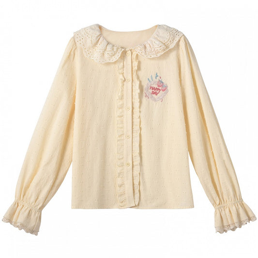 Yume Kawaii Strawberry Cake Embroidered Creamy Yellow Lace Peter Pan Collar Blouse