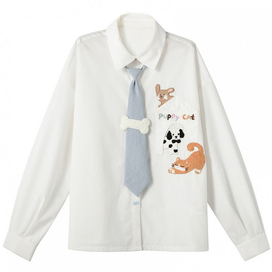 White Loose Shirt with Kitty Blue Tie Embellished and Bone Puppy Applique