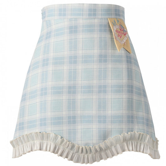 Ruffled Lace Trim Blue Embroidery White Strawberry Cake Plaid Skirt